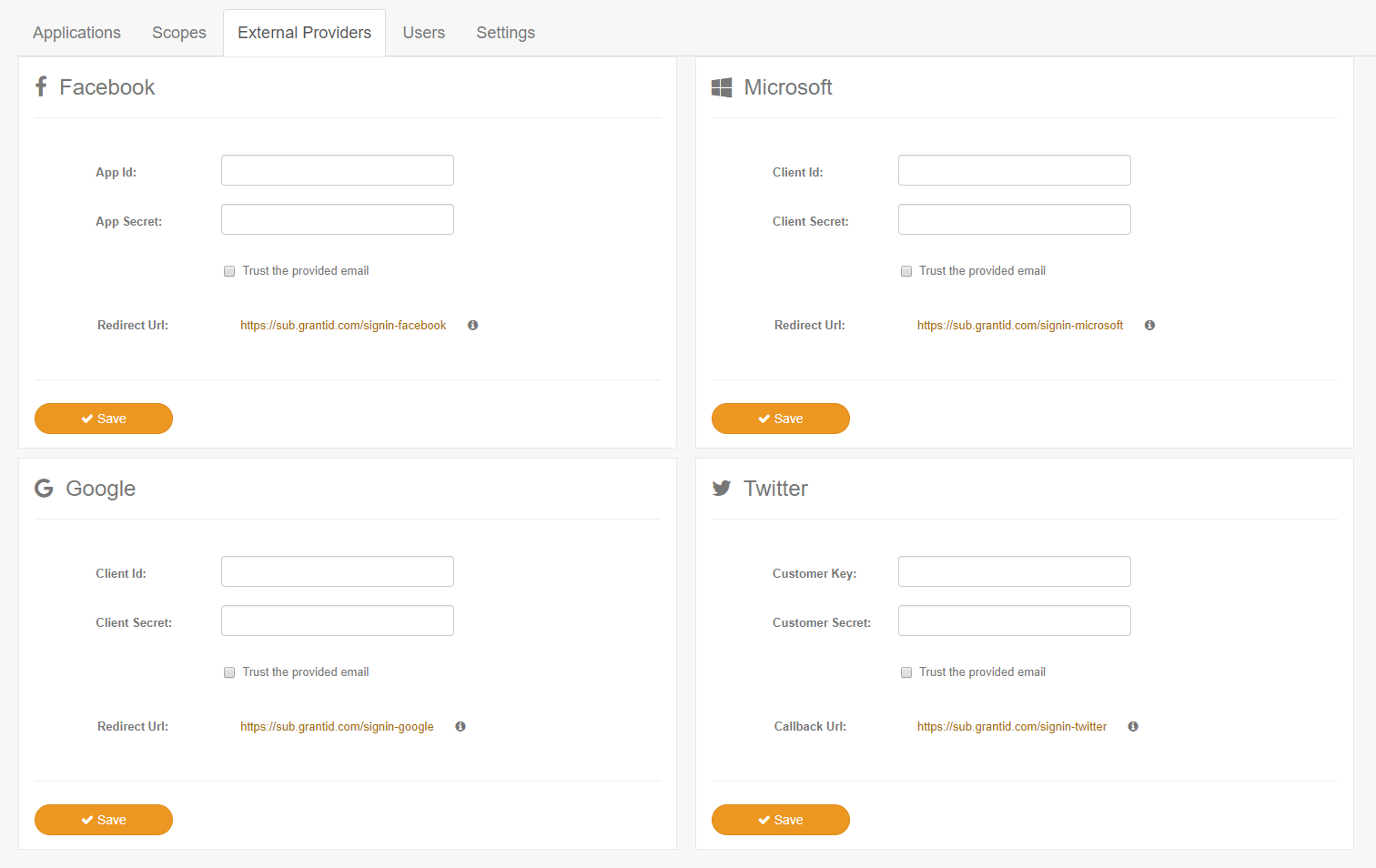 In the Identity Provider Guides section you'll find all the steps to obtain the Id and Secret parameters for each provider.