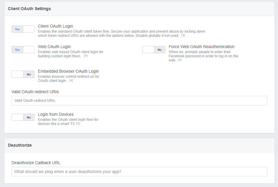 Fill the Valid OAuth redirect URIs with the Redirect URI provided by ONR (HML) External Provider's page, available in the Facebook panel, and select Save Changes.