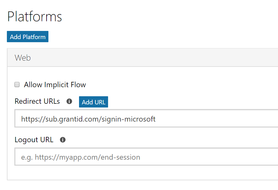 A new panel named Web will be created under the Platforms section. The Redirect URL is available in the Microsoft panel of the ONR (HML) External Provider's page.